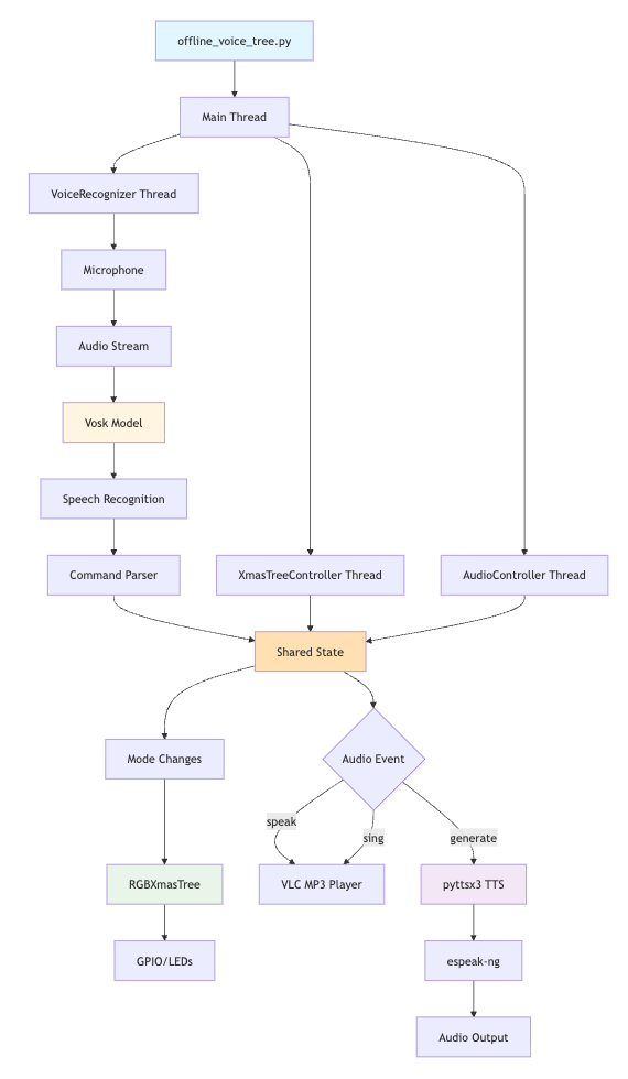 The final fully working offline_voice_tree.py script is now in Github. It supports the same set of offline commands as its online predecessor. The architecture is more maintainable and elegant as well leveraging a threading model for simultaneous voice, audio and LED control with shared memory for state. I asked Cursor to inject Mermaid system architecture diagrams into the README to render in Github. Here’s the one for offline_voice_tree.py showing how the various threads interface with other system elements: