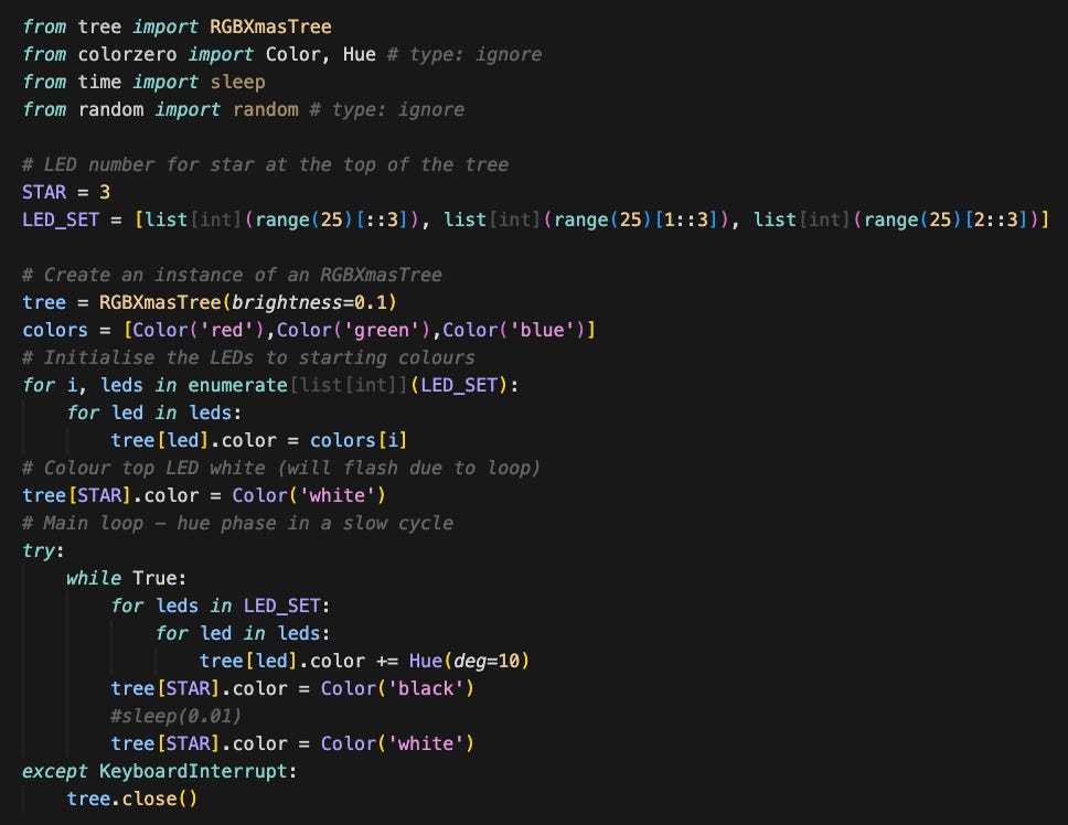 Once installed, I tried a few of the accompanying Python examples. I adapted one of them to create a short script called my-tree.py that cycled the LEDs through RGB colours to yield a nice phase effect. The image below is from a gif which shows what the setup looked like. The tree itself is only about 10cm high but the LEDs are super bright and can each be set to any RGB hue.