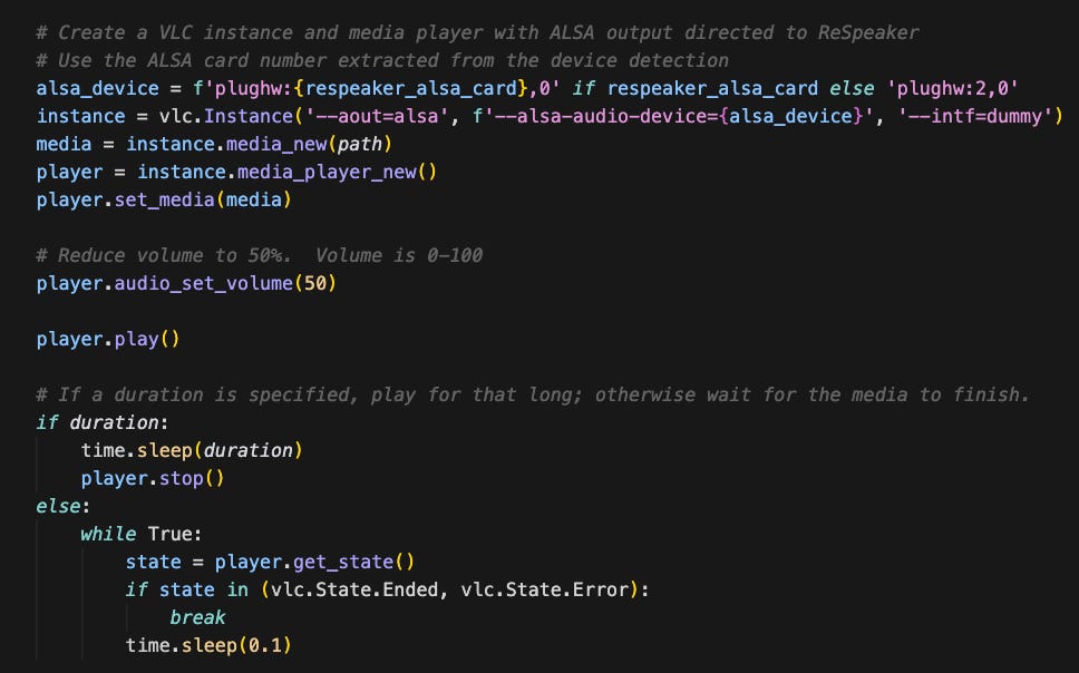 After starting afresh, I decided to figure out what was going on without using AI by refamiliarising myself with ALSA, the Advanced Linux Sound Architecture. Linux treats the ReSpeaker board as a secondary ALSA device so it is not selected as the default output. You have to probe and enumerate the available audio devices programmatically and pick the correct device index. ALSA distinguishes between raw hardware devices (hw:X,Y) and their “plug” counterparts (plughw:X,Y). The hw interface talks directly to the digital to analog converter (DAC) on the device without doing any software resampling or format conversion. For it to work, the decoded audio’s sample format, rate and channel count must already match what the hardware supports. Cursor had chosen the popular widely-available open source VideoLAN Client (VLC) media player for audio playback with hw:X,Y playback. It was failing with a “no supported sample format” error because the decoded format was incompatible with the ReSpeaker hardware. The plughw front‑end, by contrast, uses ALSA’s plug plugin to perform automatic resampling and channel conversion. Once I had configured VLC with the right parameters, playback finally worked reliably, and I could adjust the loudness via VLC’s audio_set_volume method.