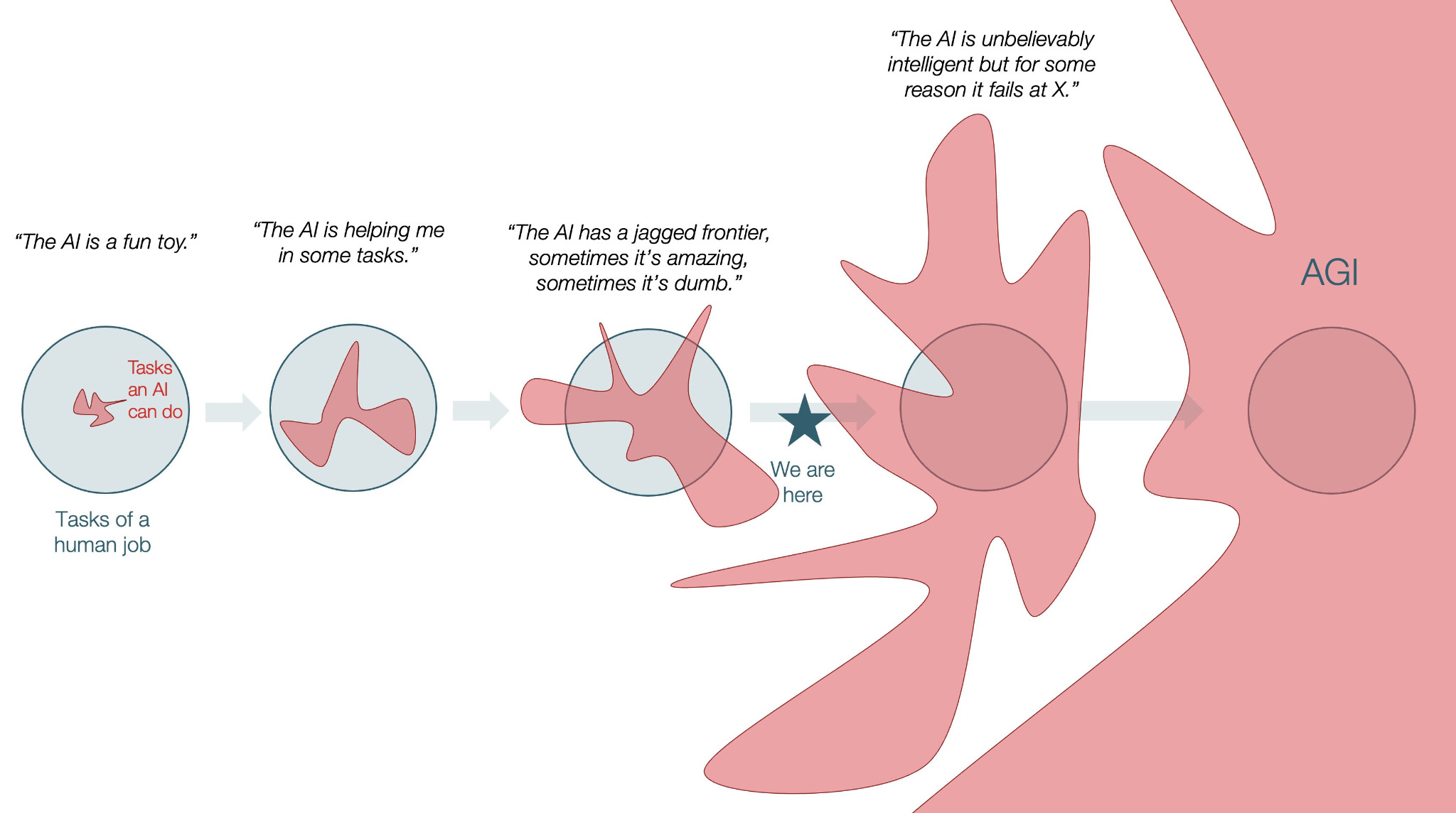 Deep learning fundamentalists, or connectionists, are convinced that AI is on a path to surpass humans at coding and everything else through scaling alone. They are sure we are en route to artificial general intelligence (AGI), namely an AI that has “the ability to understand, learn and apply knowledge across a wide range of intellectual tasks at a human level or better”. The connectionist AGI teleology supposedly emerges fully formed from today’s current ‘jagged edge’ landscape in which AI surpasses humans only in specific tasks but remains less capable in others. Here’s a view on the kinetics of the connectionist trajectory from this recent post: