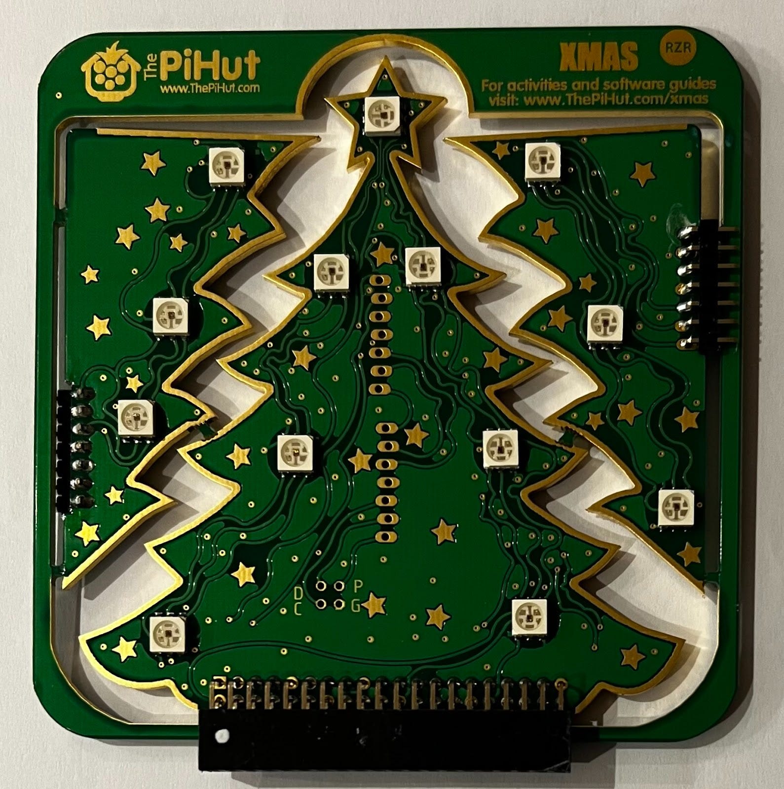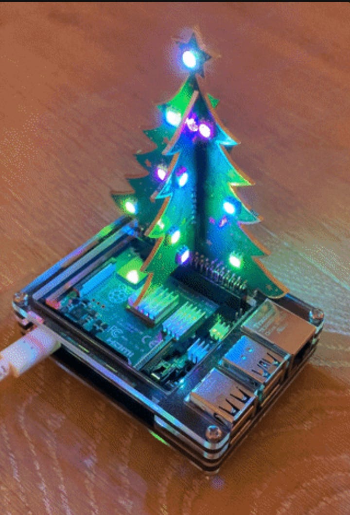 The original project was built around the 3D RGB Xmas Tree which was (and still is!) sold in kit form by PiHut. The three parts of the tree clicked together the tree plugged into the GPIO pins of a Raspberry Pi 4, the latest hardware model at that time. Here’s an image of the kit: