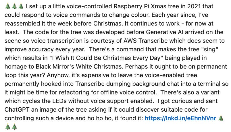 As another Christmas draws close, I’ve revisited a festive side project I worked on a few years ago to build an interactive voice controlled electronic Christmas tree connected to a Raspberry Pi. In November 2021, Generative AI and coding tools built with it were yet to arrive. However, GPT-3 and the fluency of its completions certainly had my attention. It seemed clear back then that software development and other creative activities would be significantly disrupted by transformer-based models. I’d written an early warning post about it called Storming the Citadel the year before: