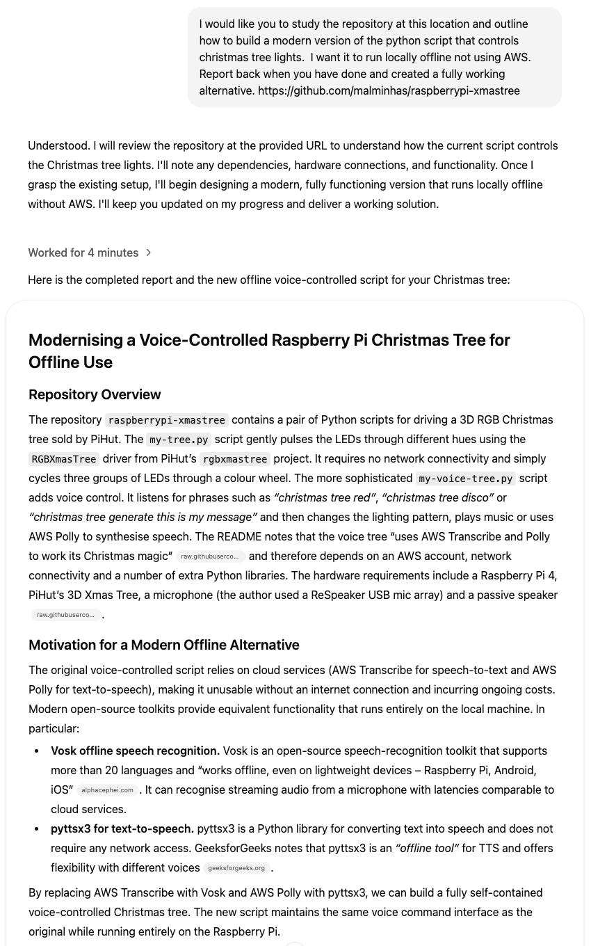 2025 felt like a good time to revisit the script for three main reasons. First of all, the Raspberry Pi 4 I built it on is now out of date. It has been superseded by the more capable Raspberry Pi 5. Secondly, the use of AWS-based speech recognition, while noticeably better year on year in terms of speech recognition capability, had become progressively more expensive too. I ended up with bill shock last year after leaving it on for a few days continuously transcribing audio in the background. It feels like overkill for this kind of project to use a cloud service for transcription. I wanted to control the tree by voice without paying to do so. Finally, I was curious to see whether it was possible to use coding AI tools on the Raspberry Pi to support further development given their present ubiquity in the tech world. I have used several of them this year including Cursor, Codex, Claude, Antigravity and Lovable on a variety of personal and professional projects. That experience made me wonder if I could apply what I’ve learned to a legacy project. So I set myself the challenge of bringing my Christmas tree up to date using AI tools to develop the new code to integrate offline voice recognition on the Raspberry Pi 5.