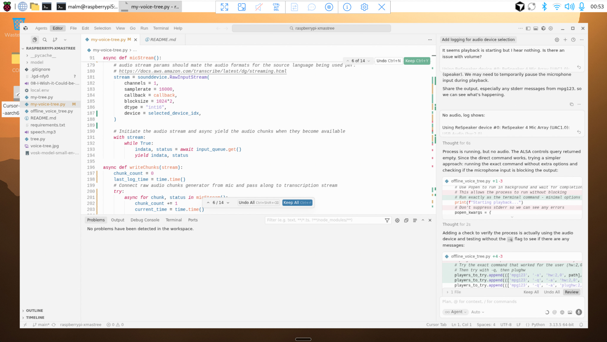 As many others have found, a fluent and comprehensive answer confidently reeled out by a large language model (LLM) is not necessarily right. I had to work through several issues in the generated source code including missing dependencies, environment variables, incorrectly named functions and finding the right directory for loading the Vosk model. If you’ve had to interface to peripherals on a Raspberry Pi, you may recognise this dance. My workflow by this point was sub-optimal. I had installed the latest version of ARM64 Raspberry Pi OS using the Pi Imager tool so I was able to use ChatGPT in the browser to generate updated versions of offline_voice_tree.py in response to my prompting. I then had to download the file, modify it to add local context and rerun it. This was acceptable for a while but I wanted a more integrated development loop. I discovered that you can download an ARM64 Linux Cursor AppImage, make it executable then run it on Raspberry Pi 5. I did so then logged in with my Cursor credentials as I would on a new laptop and found it surprisingly performant at least on the latest 8GB model hardware. I also enabled VNC support and connected to the Raspberry Pi 5 over WiFi via a client on my Macbook. This allowed me to work with it without a keyboard, mouse and monitor. Here’s a screenshot of Cursor running on the Pi: