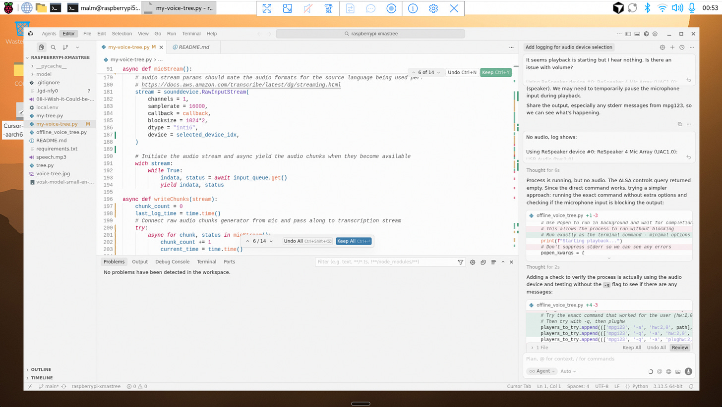 Using Cursor and VNC allowed me to iterate faster and improve code organisation and supporting documentation. Not long afterwards, I had a version of offline_voice_tree.py working without AWS support using offline speech recognition with Vosk. A fully self-contained, offline, voice-controlled Christmas tree. This first stage of development converting voice audio input to text passed remarkably smoothly.