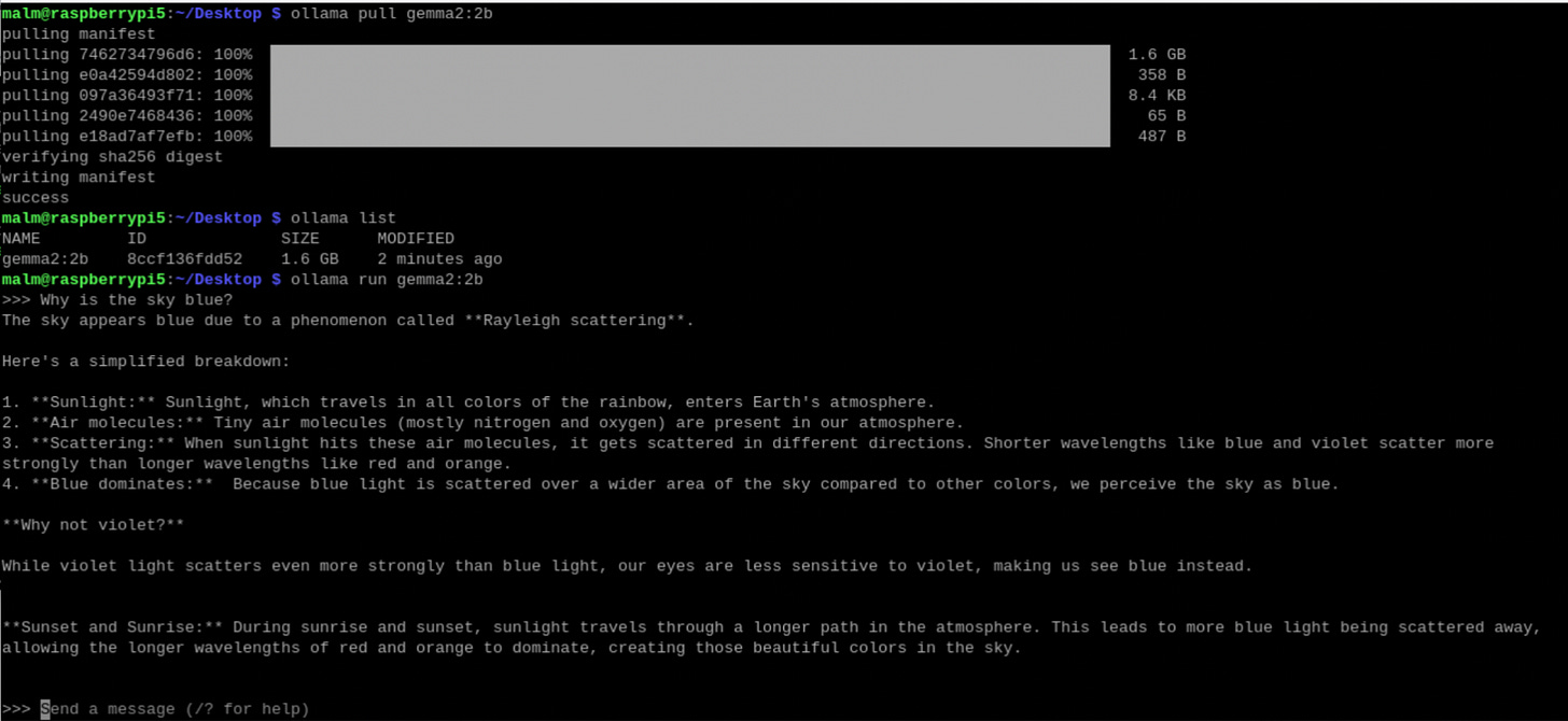 It’s worth noting that while AI was used to support its development, the offline_voice_tree.py script itself to this point has not used AI itself right now. Vosk as we have seen does not use an LLM. Its main function is to convert spoken audio into written text in a similar fashion to AWS Transcribe, not to understand context, generate human-like text, or answer complex queries like an LLM would. A next step could be to combine Vosk with a small local LLM on the device to create an interactive voice agent. The general consensus from reading around is that Google’s open weight gemma2 2b model is a good choice. It can operate at around 4 tokens/second output on a Raspberry Pi 5. Installing it via the ollama tool is straightforward. It is of course slower than using ChatGPT but its response to the question “Why is the sky blue?” shown below is entirely generated on the device without any cost being incurred other than the electricity to power it. This is a more sustainable and cost-effective use of AI than leveraging a Big AI foundation model running in a data centre likely powered by gas somewhere in the US: