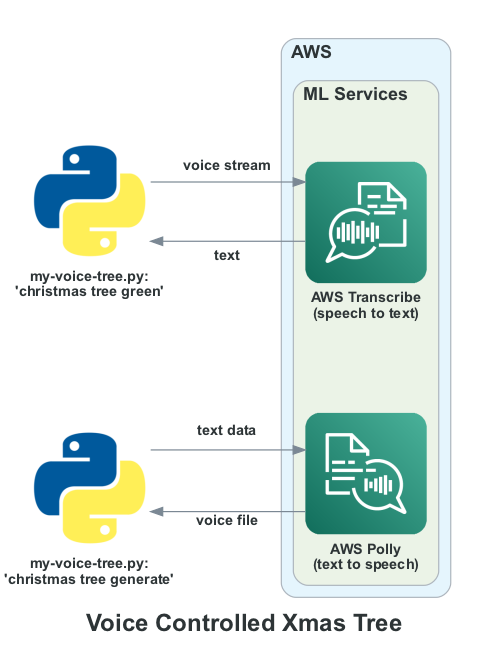 The result was a script called my-voice-tree.py in Github here which was built to interface to a ReSpeaker USB MicArray from Pimoroni as well as a cheap 3.5mm jack based speaker. It invoked two pay as you go Amazon Web Services APIs called AWS Transcribe and AWS Polly. AWS Transcribe is an ASR (automatic speech recognition) service which converts the incoming speech stream to text. The audio input is converted to a stream and sent to AWS Transcribe which returns the corresponding text. That text is parsed to extract commands which are only triggered if the wake phrase “christmas tree” is found within the text. For example uttering “christmas tree green” changes the LEDs to green.