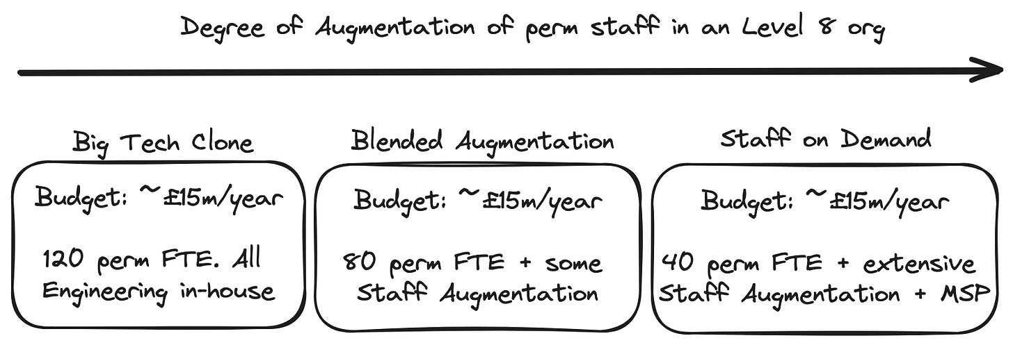 At the opposite end of the spectrum is the Staff on Demand model evangelised in the book Exponential Organizations (ExO) by Salim Ismail and others. This approach involves shrinking the permanent team to just a few key leadership roles including Product Managers (PM), Principal Engineers, Senior Engineering Managers (SEM), Engineering Managers (EM) plus Data Engineering and Science staff. These core team members work closely with business leadership to define product architecture, technical metrics, and roadmaps. Delivery is then managed by plugging in entire teams from external partners, which can include both Design and Engineering implementation resources. These external Staff on Demand resources could be supplied either via Staff Augmentation referenced earlier through to Outsourcing or Managed Service Provision (MSP). They can be far more easily flexed quarter to quarter adapting to changing business needs. For a large number of tech-enabled businesses, a variant of the Staff on Demand model may make more sense from a capital allocation perspective than attempting to build the organisational equity to do everything in-house. They operate a smaller fixed base of staff and then flex resources according to business need on top. It’s a model that is likely to grow in significance in the future as explored in this article on the coming wave of fractionalized employees which is a closely related topic.